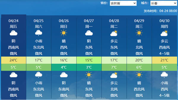 r根据预报,未来三天,吉林降雨将发展增多,气温先升后降。吉林省气象台预计,今天,全省多云,白城北部、长春东部、四平东部、辽源、吉林、通化、白山、延边、长白山保护开发区有阵雨或雷阵雨。白城、延吉最高气温17℃左右,其他地区21至24℃。西部地区有3级左右偏南风转西北风,中部地区有3级左右转4至5级西南风,瞬间风力可达6至7级,其他地区有3级左右偏南风。