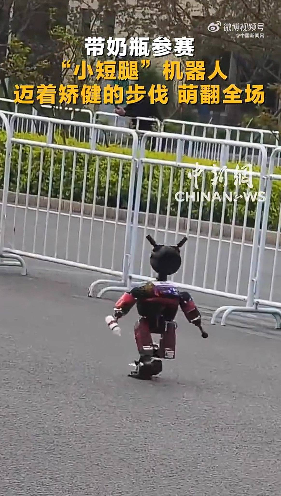 从视频中可以看到,这款机器人通体红色,迈着矫健的步伐跑遍全场,手里还拿着一个奶瓶。被网友戏称为“小机器人还没断奶就出来跑马拉松了”。