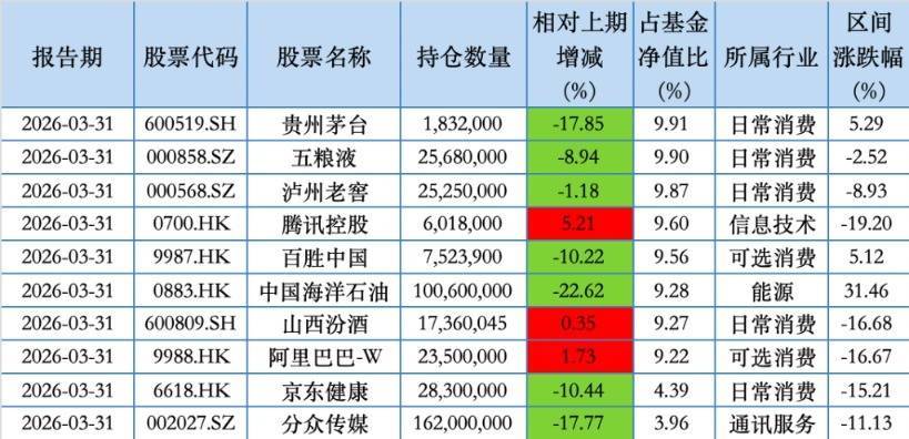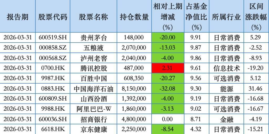 与上述两只基金操作类似的是,在2026年一季度,由张坤管理的易方达优质企业三年持有同样减持了贵州茅台、五粮液、泸州老窖;还减配了百胜中国、中国海洋石油、京东健康、山西汾酒与阿里巴巴。