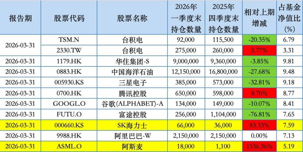 对应到个股更迭方面,阿斯麦(ASML.O)、SK海力士(000660.KS)的持仓数量较此前大幅度增加,增持比例分别为1536.36%、83.33%;此外,易方达亚洲精选还小幅度增持了台积电(2330.TW)。