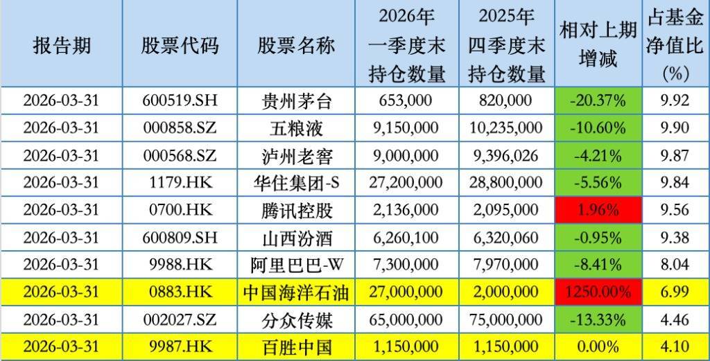 具体来看,2025年末时位列隐形重仓股(第11名至第20名重仓股)的中国海洋石油、百胜中国(09987.HK)在2026年一季度新进持仓前十;其中,张坤在这只基金中大幅度增持了中国海洋石油,加仓比例高达1250%。